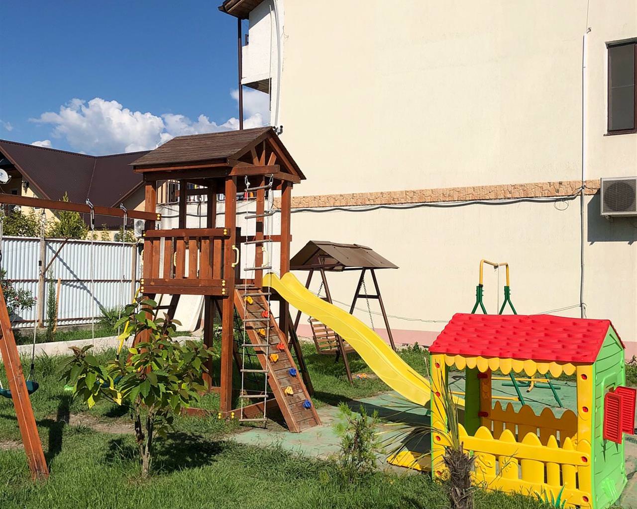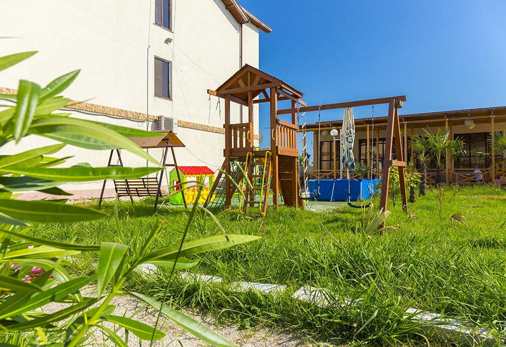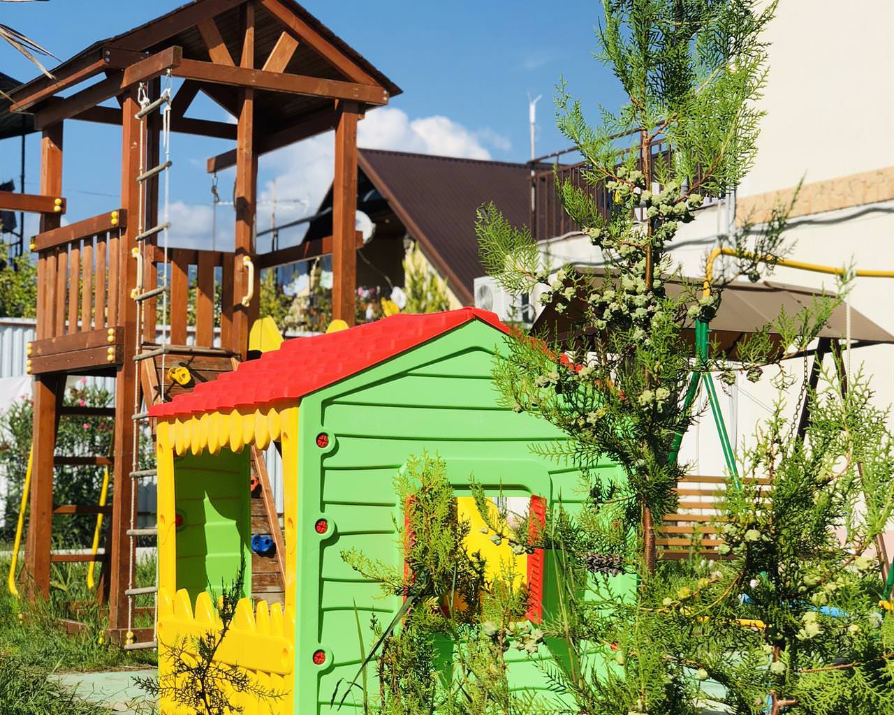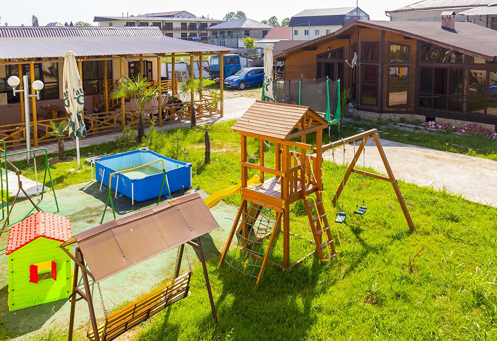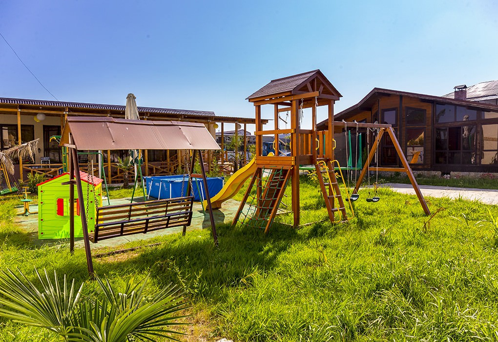 Юным гостям на участке построена детская площадка с горками и батутом, а также специальным бассейном.