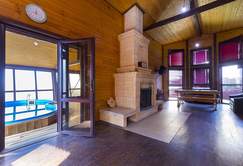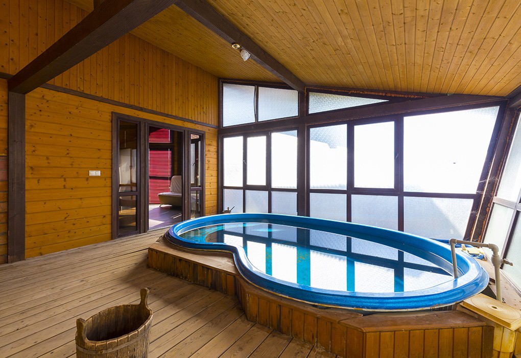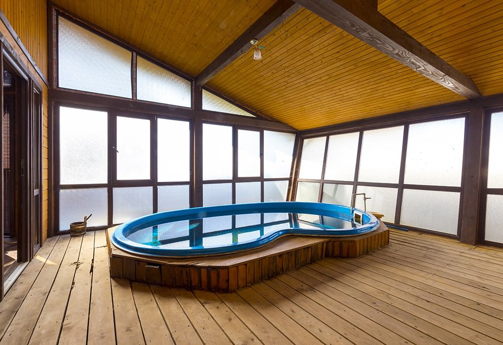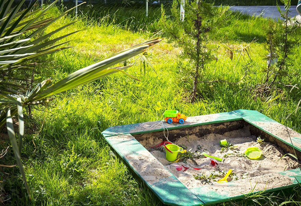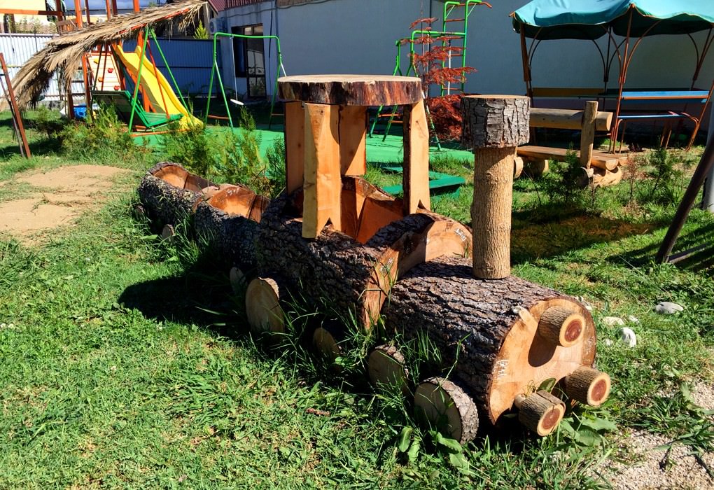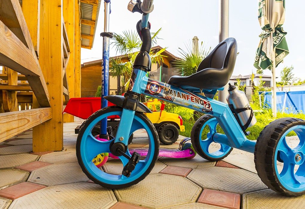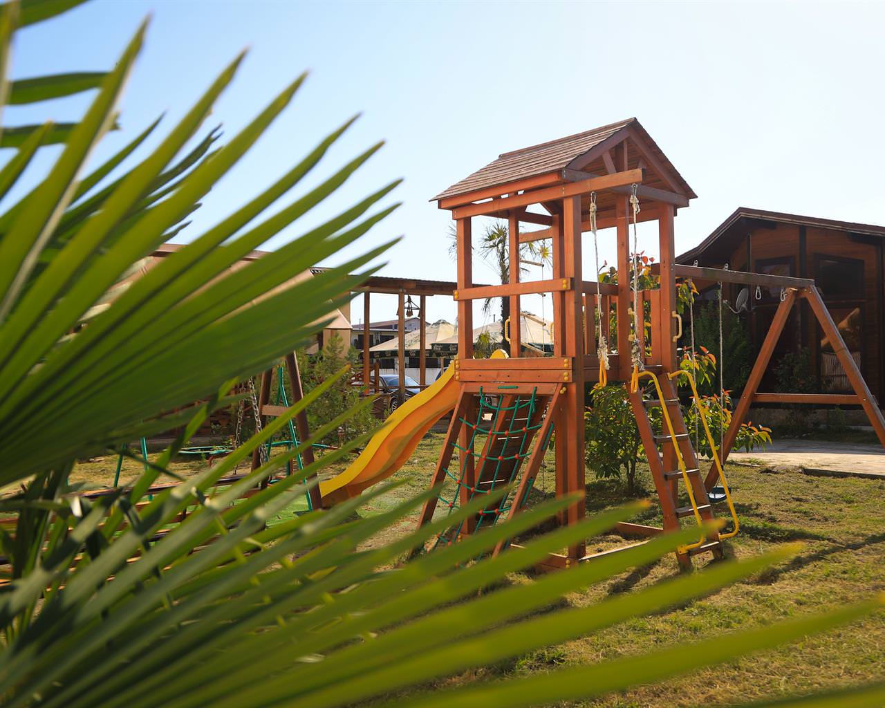Юным гостям на участке построена детская площадка с горками и батутом, а также специальным бассейном.